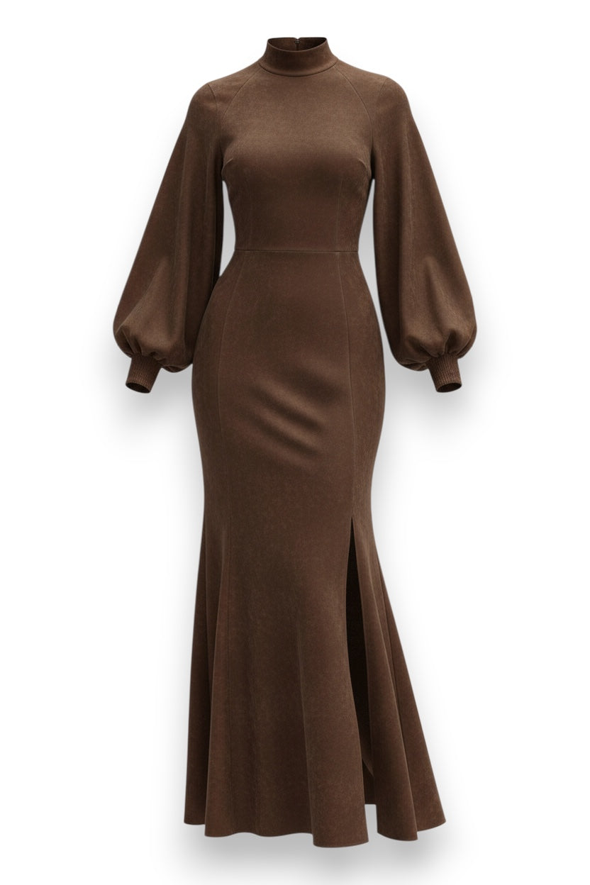 Harriet | Midi Dress in Vintage Suede brings classic femininity to the present. The soft suede-like fabric, elegant high collar, and lantern-inspired sleeves create a romantic yet well-tailored silhouette, comfortable to wear all day and perfect for accentuating the figure without being tight. The flowing hem and front zipper add movement and practical function, ideal for both everyday and special occasions.